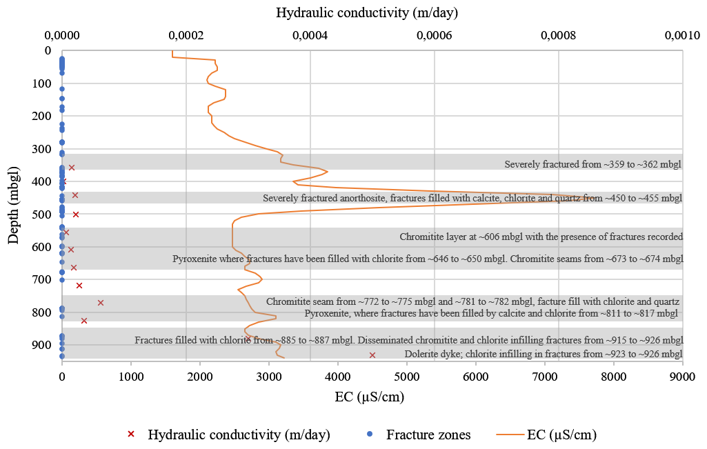 The rocks of the Upper Critical zone are characterised by low primary porosity due to their crystalline nature. However, fracturing within these units enhances secondary porosity, thereby increasing their permeability and the potential for fluid flow. These fractures range from ∼ 100 to ∼ 500 m b.g.l., which represents the shallow to intermediate aquifer. The presence of these fractures can be observed in the lithological logs and hydrological data (Fig. 2). Additionally, the presence of serpentinite suggests hydrothermal alteration, which may further enhance fracture permeability and fluid transport capacity.