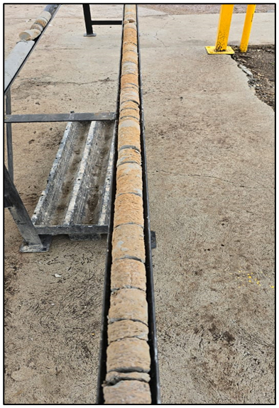 Figure 3Re-drilled cement core (diameter of ∼ 50 mm) from the depth interval of approximately ∼ 1150 to ∼ 1270 m b.g.l. The distinct places where fluid flow prevented the cement from curing provide visual evidence of significant groundwater inflows and active water movement through fractures or permeable zones at these depths (photograph taken by Pieter Frederik Grobler).