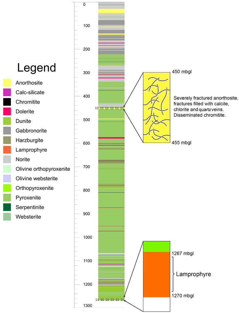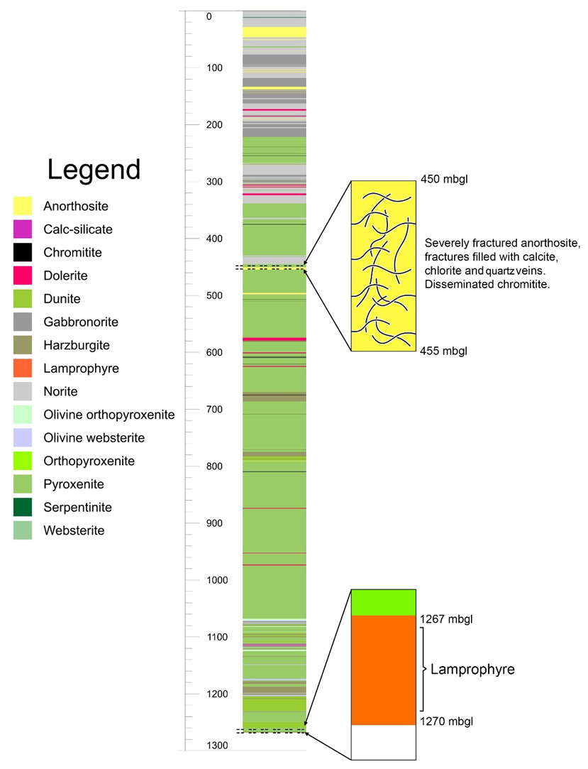Figure 4Lithological log of the BVDP well on the eastern limb of the RLS down to a depth of ∼ 1270 m b.g.l. Mafic rocks dominate the Upper Critical zone sequence, intersected down to a depth of 500 m b.g.l., with the Lower Critical zone consisting of ultra-mafic rocks. Between ∼ 450 and ∼ 455 m b.g.l., a severely fractured anorthosite layer was intersected, demonstrating evidence of potential hydrothermal alteration through fractures filled with calcite, chlorite and quartz. A lamprophyre dyke was intersected at a depth of ∼ 1267 m b.g.l.