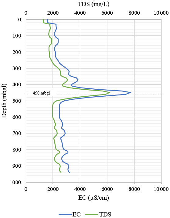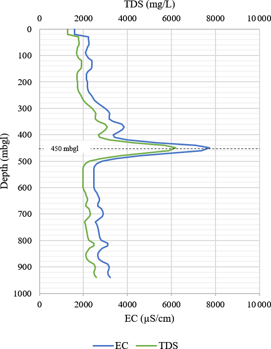 Figure 5Variation in TDS with depth in the BVDP well. TDS was derived from the measured EC obtained through down-hole hydrogeological logging (a factor of 0.8 was used for the conversion for deep groundwater). A significant spike in TDS is observed at 450 m b.g.l.