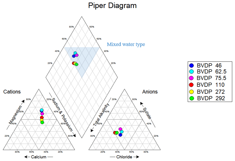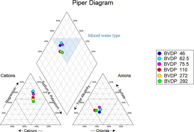 Figure 6The Piper diagram of the Phase-1 depth-specific groundwater samples indicates an overall mixed water type.