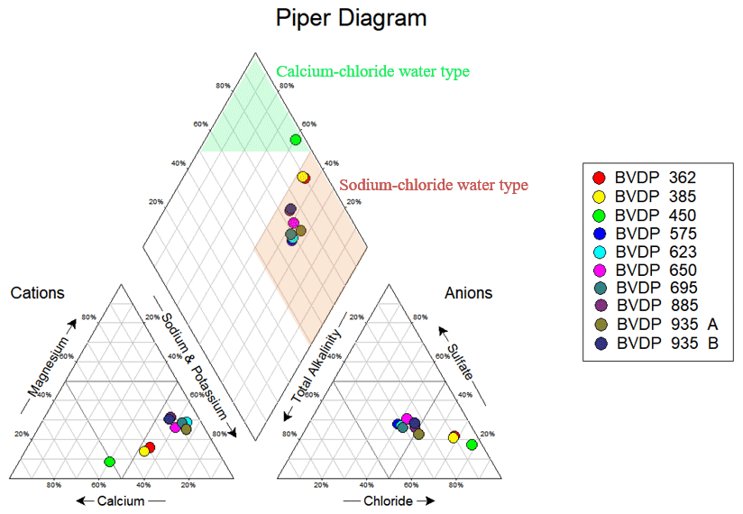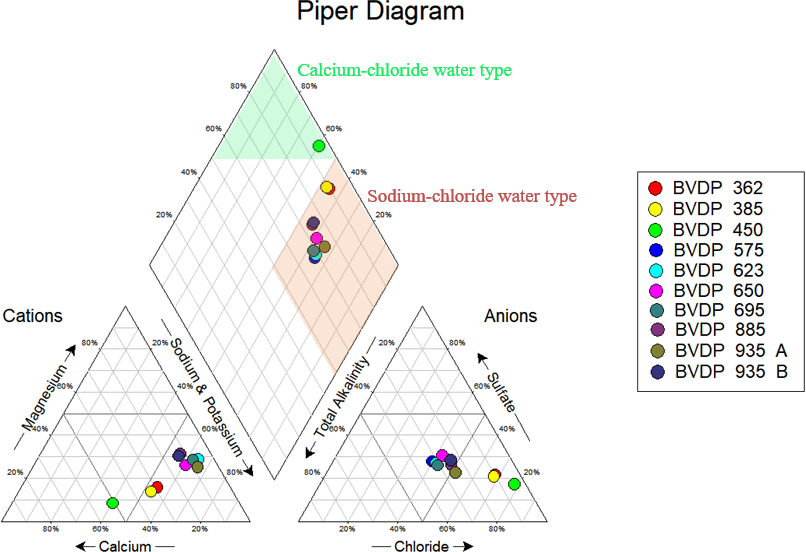 Figure 7The Piper diagram for the Phase-2 depth-specific groundwater samples indicates an overall sodium chloride water type, except for the sample collected at 450 m b.g.l., which is characterised as a calcium chloride water type.