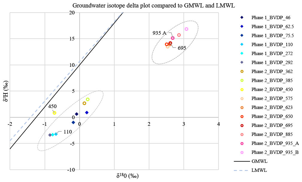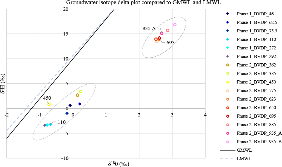 Figure 8The distribution of the Phase-1 and Phase-2 depth-specific groundwater samples based on stable isotope analysis. Duplicate samples were collected for the samples at 935 m b.g.l. Every groundwater sample is positioned to the right of the GMWL (δ2H = 8δ18O + 10) (Craig, 1961) and the LMWL (δ2H = 7.56δ18O + 10.64) as defined for groundwater in Thohoyandou, Limpopo Province, by Durowoju (2019). The plot reveals two distinct groupings of the data: samples taken at depths shallower than 450 m b.g.l. and those taken at depths deeper than 450 m b.g.l. The sample at 450 m b.g.l. has a distinct isotopic plot, being isolated from the samples shallower than 450 m b.g.l.