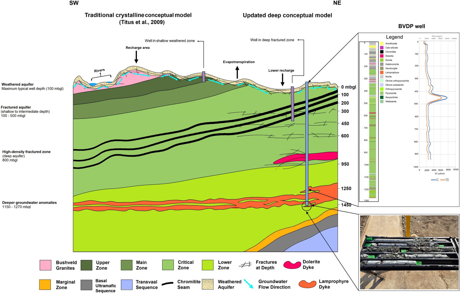 Figure 9The updated hydrogeological conceptual model of the Bushveld Complex includes several aquifer systems in association with the lithological units of the Complex as compared to the traditional hydrogeological model (Titus et al., 2009). Weathered aquifers exist in the shallow weathered zone, where perched aquifers may have a hydraulic connection to rivers. Deeper fractured aquifers have fractures extending between ∼ 100 and ∼ 500 m b.g.l., with a high-density fractured zone at ∼ 800 m b.g.l. Deeper groundwater anomalies are observed from ∼ 1150 to ∼ 1270 m b.g.l., likely to be correlated with the lamprophyric dyke encountered at ∼ 1267 m b.g.l., as shown by the core image in the bottom-right corner. The two figures to the right show Figs. 4 and 5 in relation to the updated hydrogeological conceptual model.