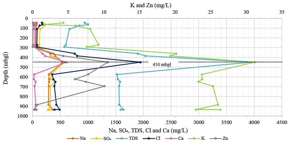 Figure 10The graph displays the chemical parameters (sodium, sulfate, TDS, chloride, calcium, potassium and zinc) with increasing depth of the deep exploration well. The highest concentrations of these chemical parameters are measured at a depth of 450 m b.g.l.