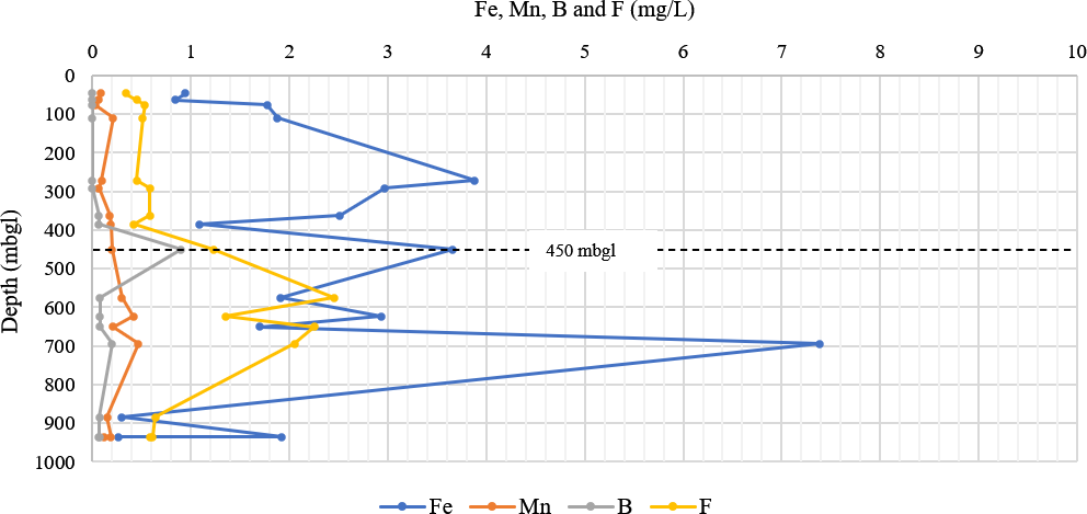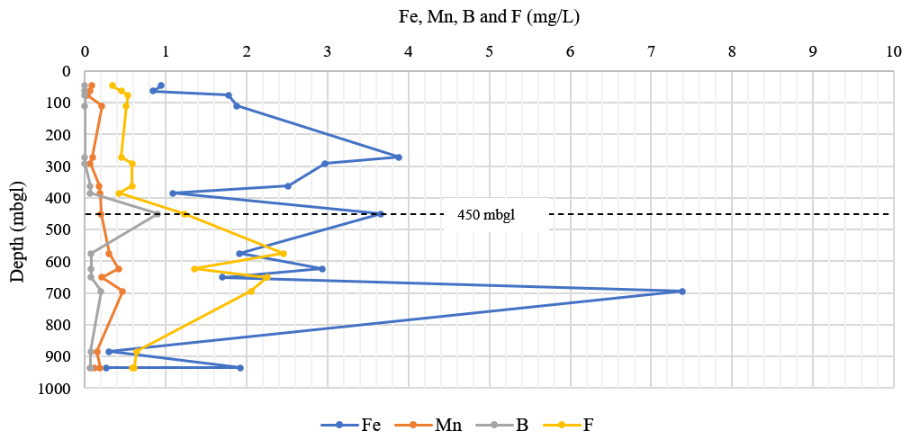 Figure 11The graph displays the chemical parameters (iron, manganese, boron and fluoride) with increasing depth of the deep exploration well. Iron concentration increases significantly at 272, 450 and 695 m b.g.l., with the highest concentration being measured at 695 m b.g.l. The manganese and fluoride concentrations increase significantly from 450 m b.g.l. The highest concentration of boron is observed at 450 m b.g.l., after which the concentration decreases with depth.